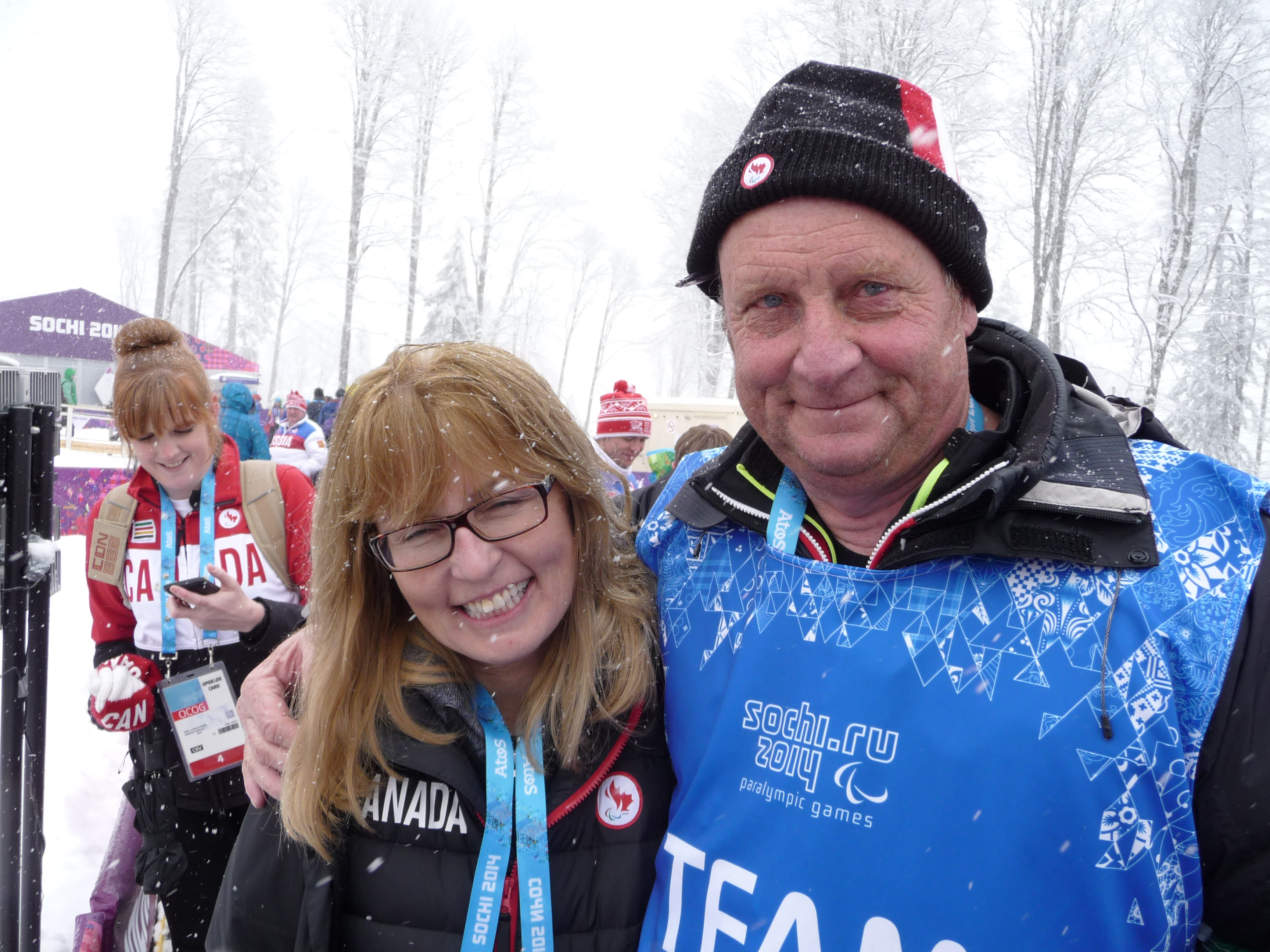 Which bring me to how nice our athletes are. Brian McKeever (and his brother and coach Robin) are some of the nicest people you’ll meet. I think I saw Brian shiver in his race suit because he was spending so much time talking to fans (me included). And maybe, that’s something that started early at home, but I know that long time coach and mentor Kaspar probably had something to do with it. When Kaspar (pictured here with CPC CEO Karen O’Neill – another one of many nice and incredibly competent person I get to work with) asks how you’re doing, he means it!