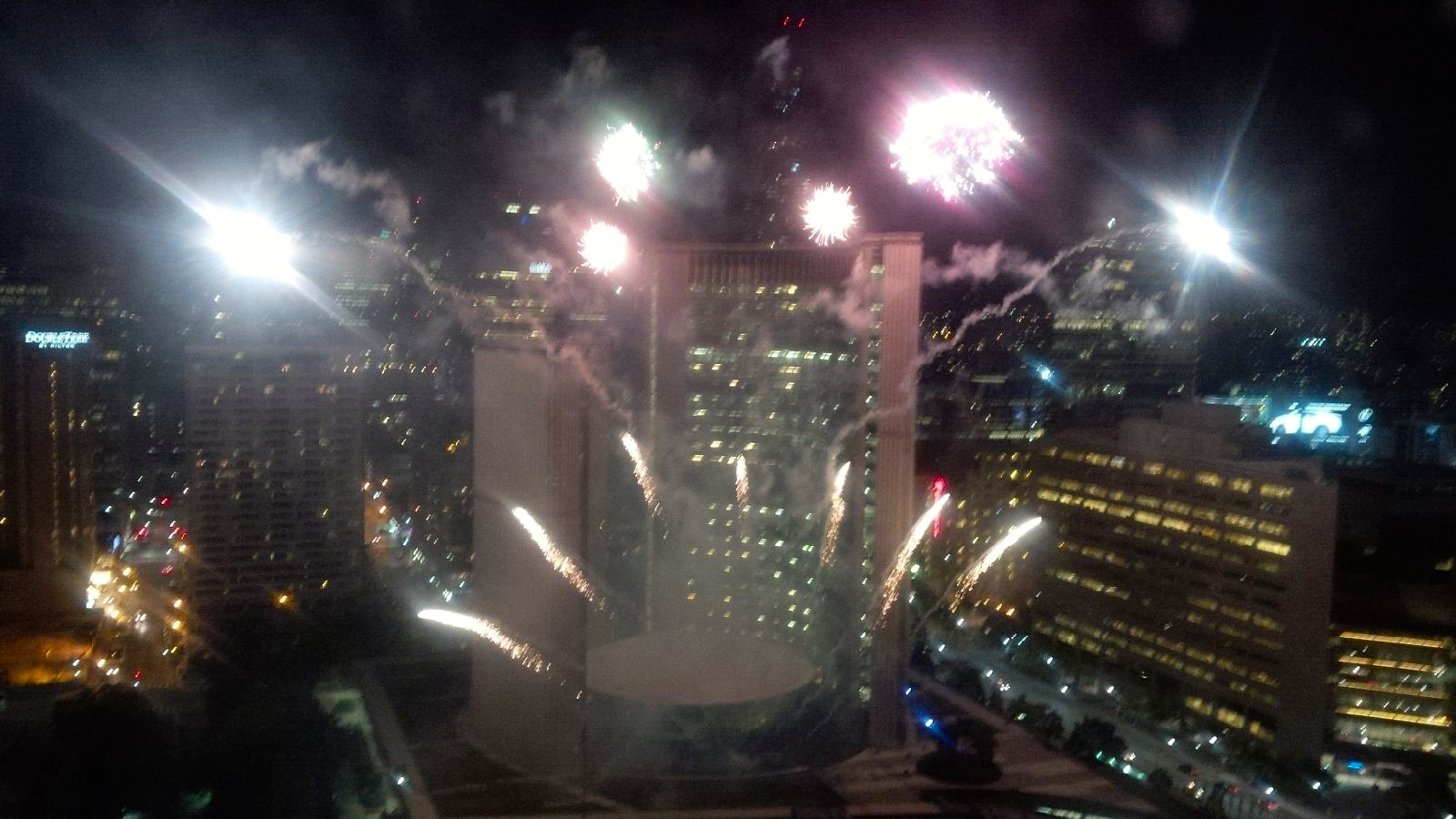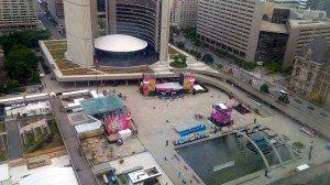 I unpack my suitcases as the sun rises. This will be my view for the rest of the games. It’s quiet now, but won’t be for very long. In fact, Nathan Phillips Square is packed with people attending the free concerts every night. Up to 14,000 people I am told and from my perch, I have no idea how they all get out of there after the concert in orderly fashion. But they seem to do it every night – right at 11PM. There is a certain routine establishing itself here. The concert finishes at 10:50PM and then the Games theme song goes on with a spectacular display of fireworks every night. So no going to bed before 11PM on the North side of the hotel! I even worry about the kids in the room next to me – they’re getting pretty loud and agitated. I hope for their parents that they settled in. I have not idea – I’m sound asleep by 11:05.